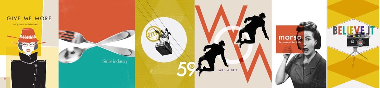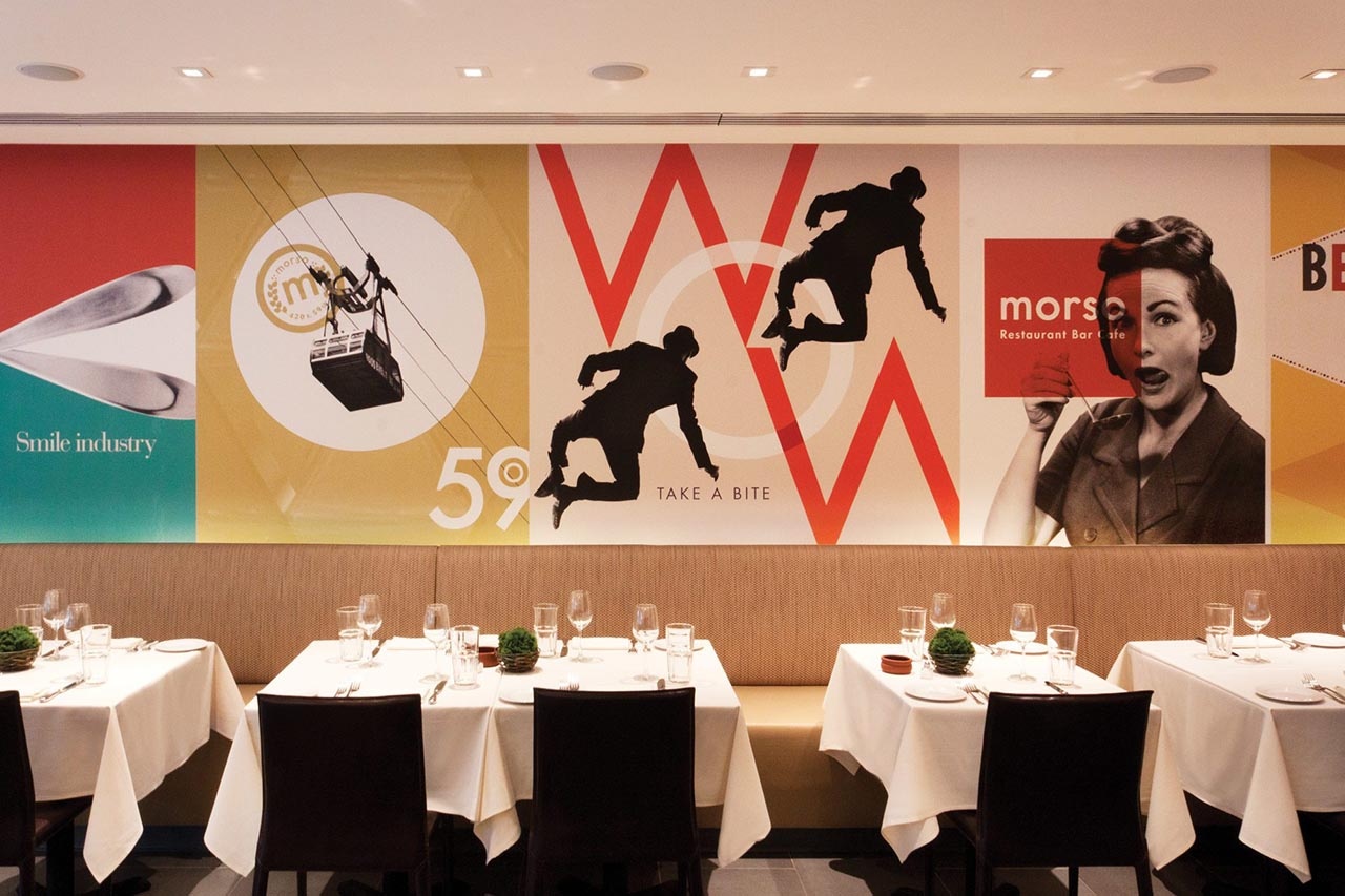 正如餐廳將經(jīng)典意大利菜肴融入當代風格一樣,我們?yōu)榻?jīng)典外觀增添了新鮮感。由于菜單靈感來自60年代的菜肴,我們以Pop Art為基礎(chǔ),重新混合顏色和圖像,營造出現(xiàn)代意大利風格。我們通過費里尼稱之為沃霍爾。
