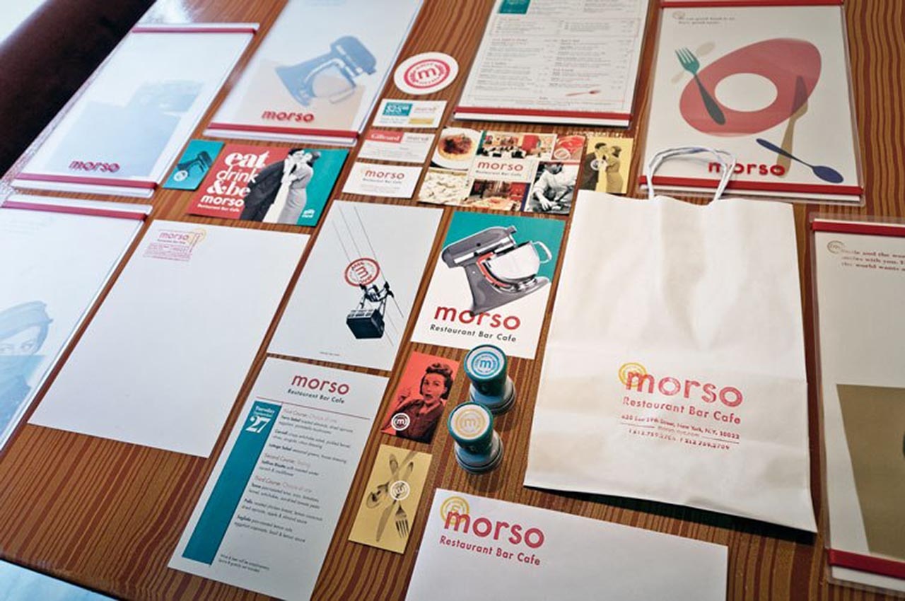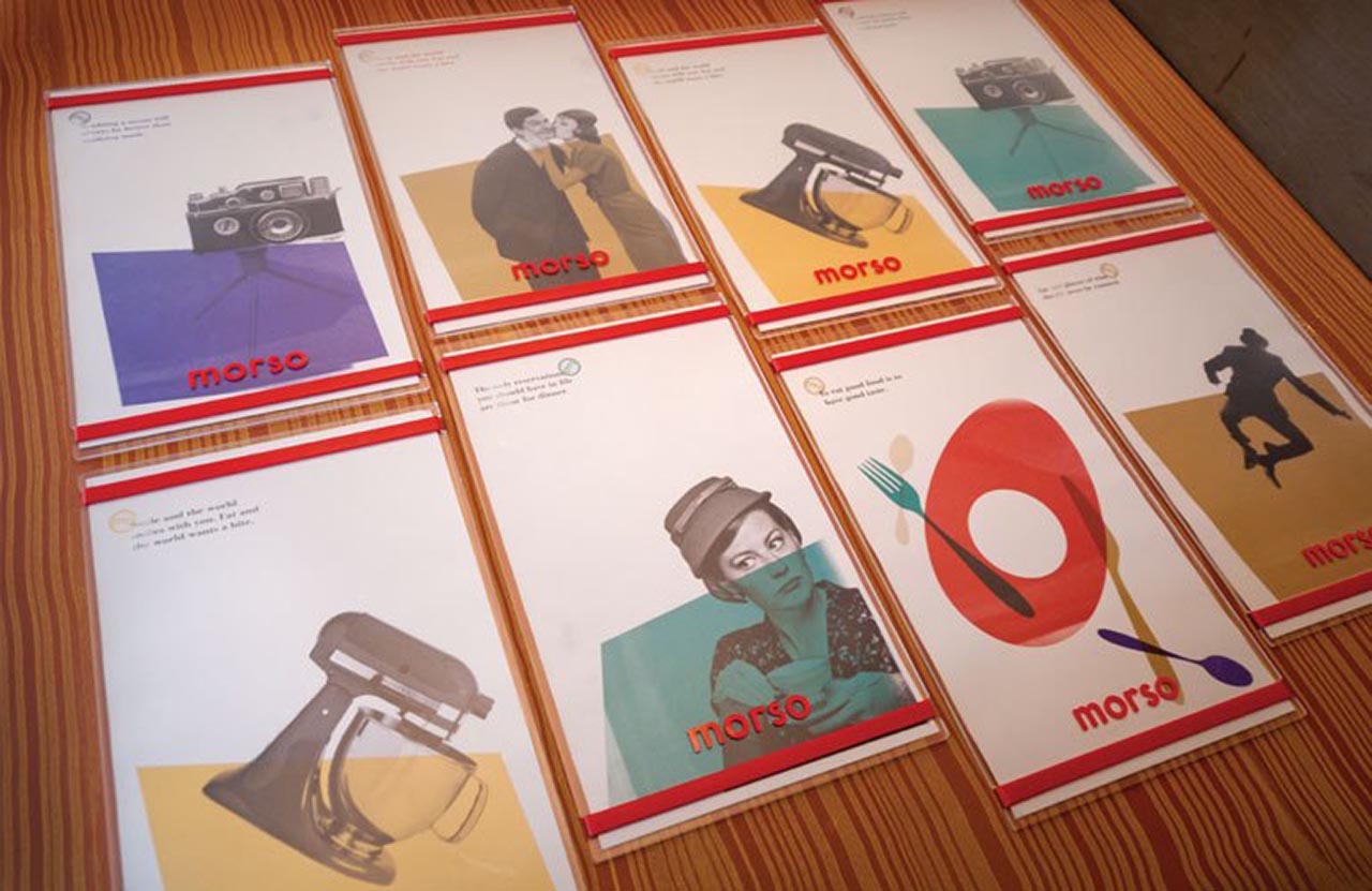 就像家庭式的菜肴一樣,我們想要設(shè)計一個讓人感到舒適和放松的空間。菜單簡短而充滿活力,可以保持對話流暢。我們用大膽,明亮的海報填充墻壁,并飾有厚厚的厚臉皮,如“嘴里滿是沉默的金色”和“吃,喝,做Morso。”這是一種食客所喜愛的氛圍,適合廚師Pino豐富多彩的氛圍。個性完美。