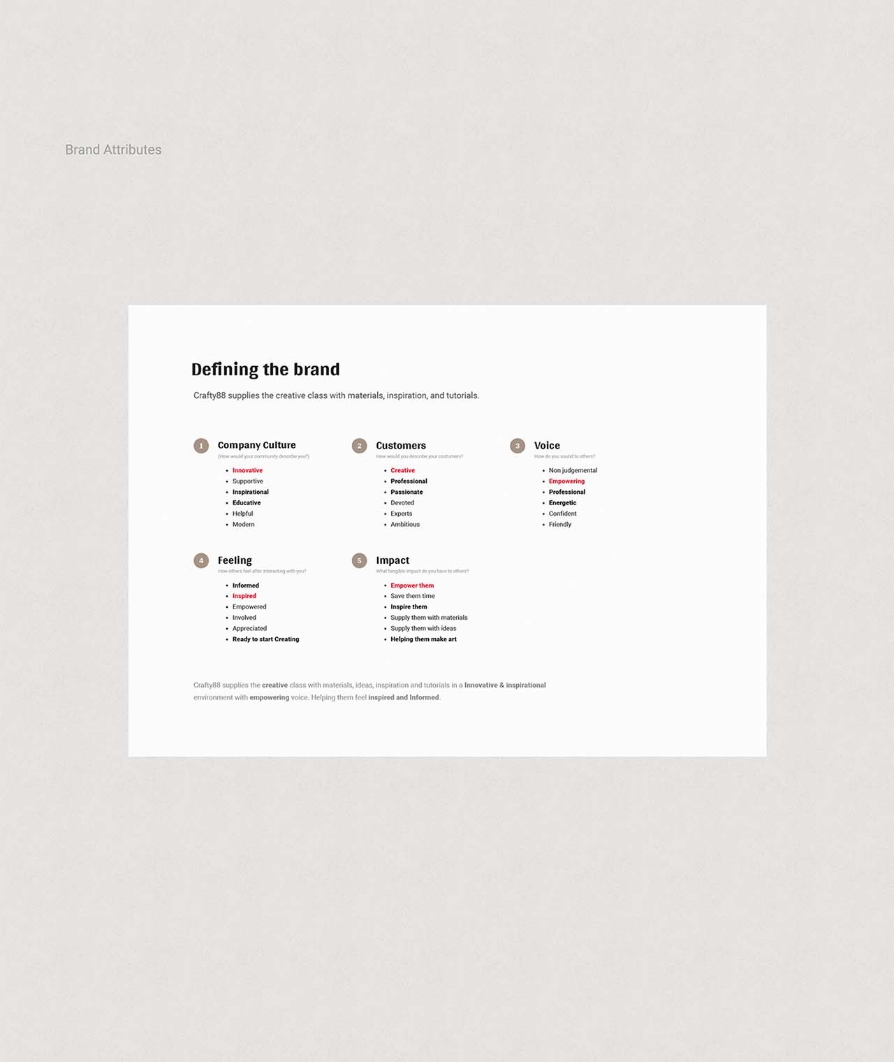 “無論你是畫家,雕塑家,剪貼簿師還是建筑師,你總是從空白的畫布開始,用你的想象力填寫它”Crafty88真的是關于這一點,是藝術家的起點和工具。在我們?yōu)榇隧椖吭O定目標后,我們概述了理想的用戶角色,并定義了品牌屬性。我們努力吸引的客戶是專業(yè)藝術家,他們毫不猶豫地使用高質(zhì)量的工具和材料。